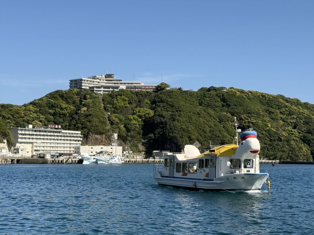 那智勝浦の港からうらしま丸で移動です!見えている建物はすべてホテル浦島。